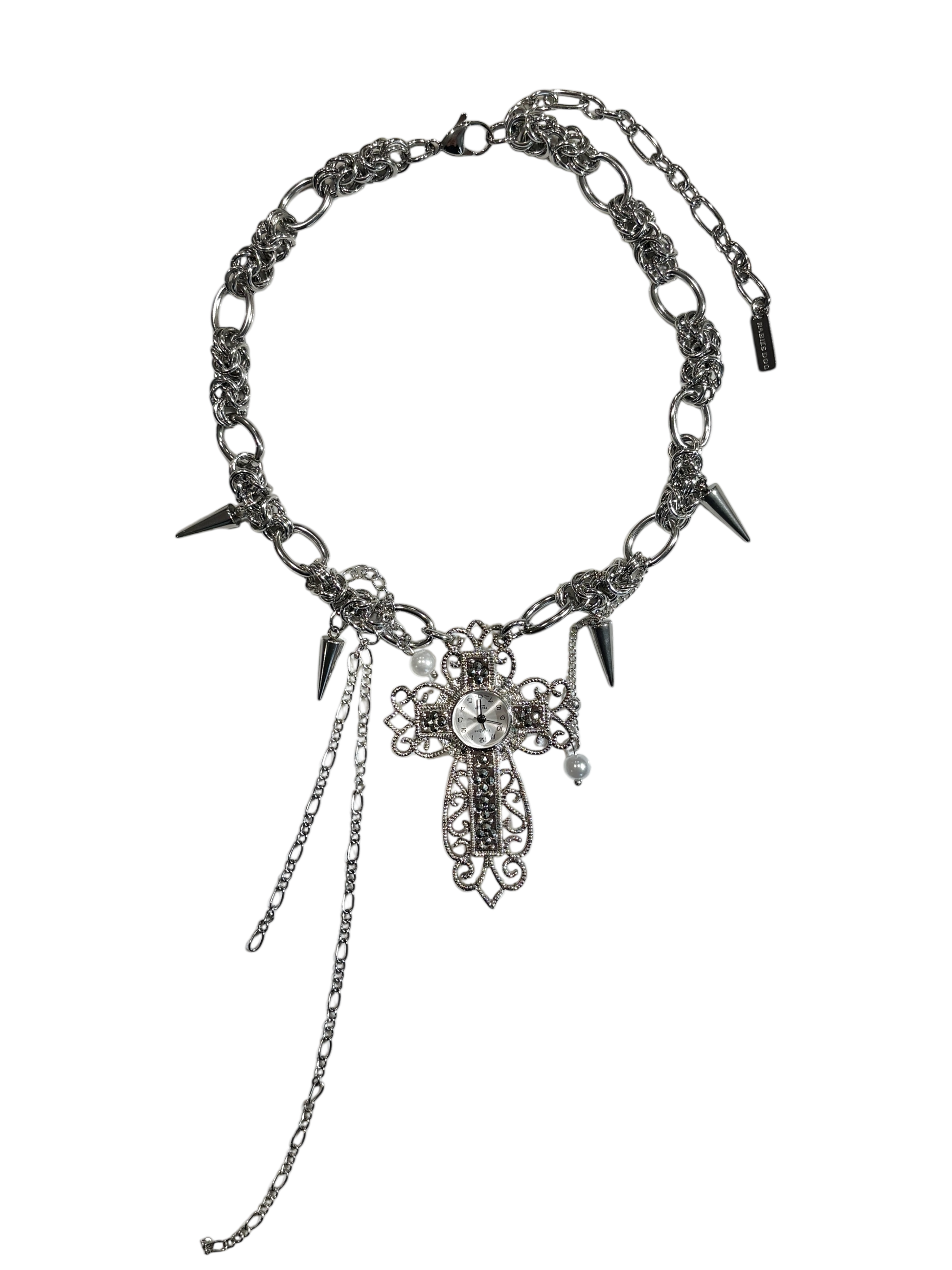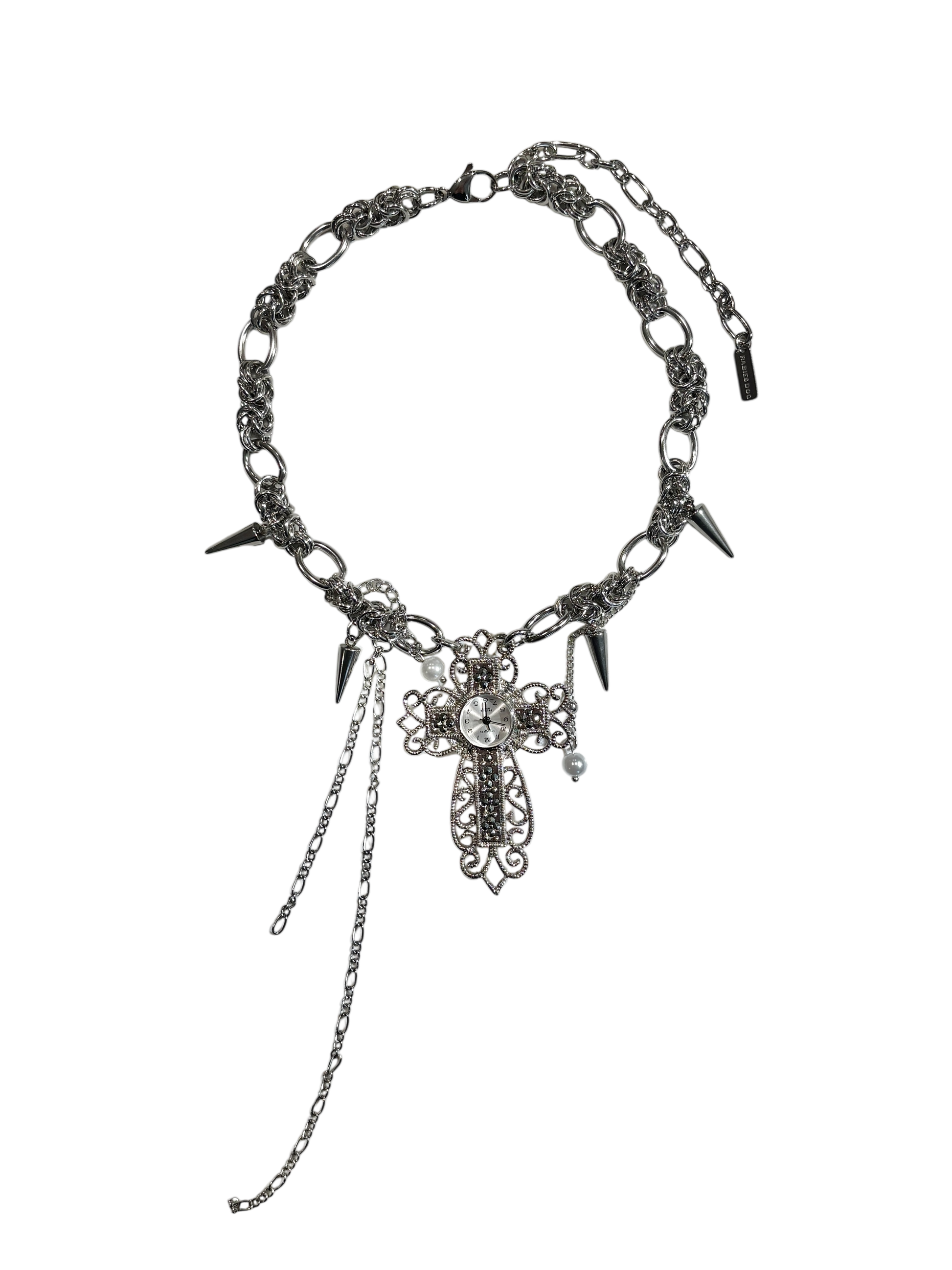 Time and form collide in this asymmetrical choker, where a reclaimed cross watch swings amid chains and spikes