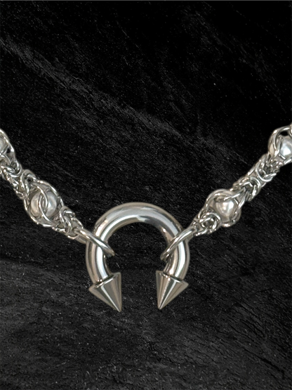 - Features a pearl encased in byzantine chain design with oversized piercing