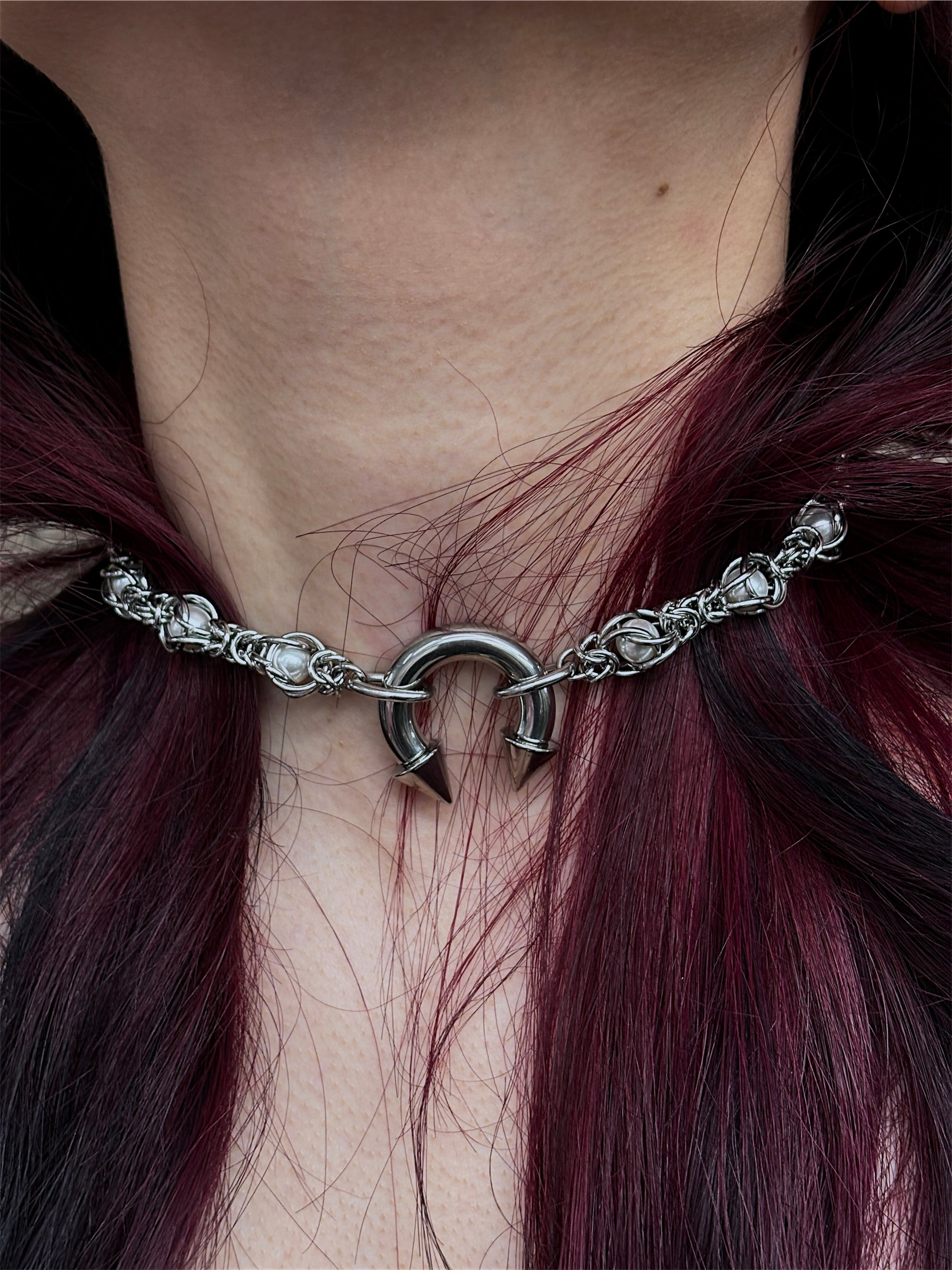 Bold glam. This stainless steel necklace blends a pearl-encased byzantine chain with an oversized piercing. Edgy and unforgettable.