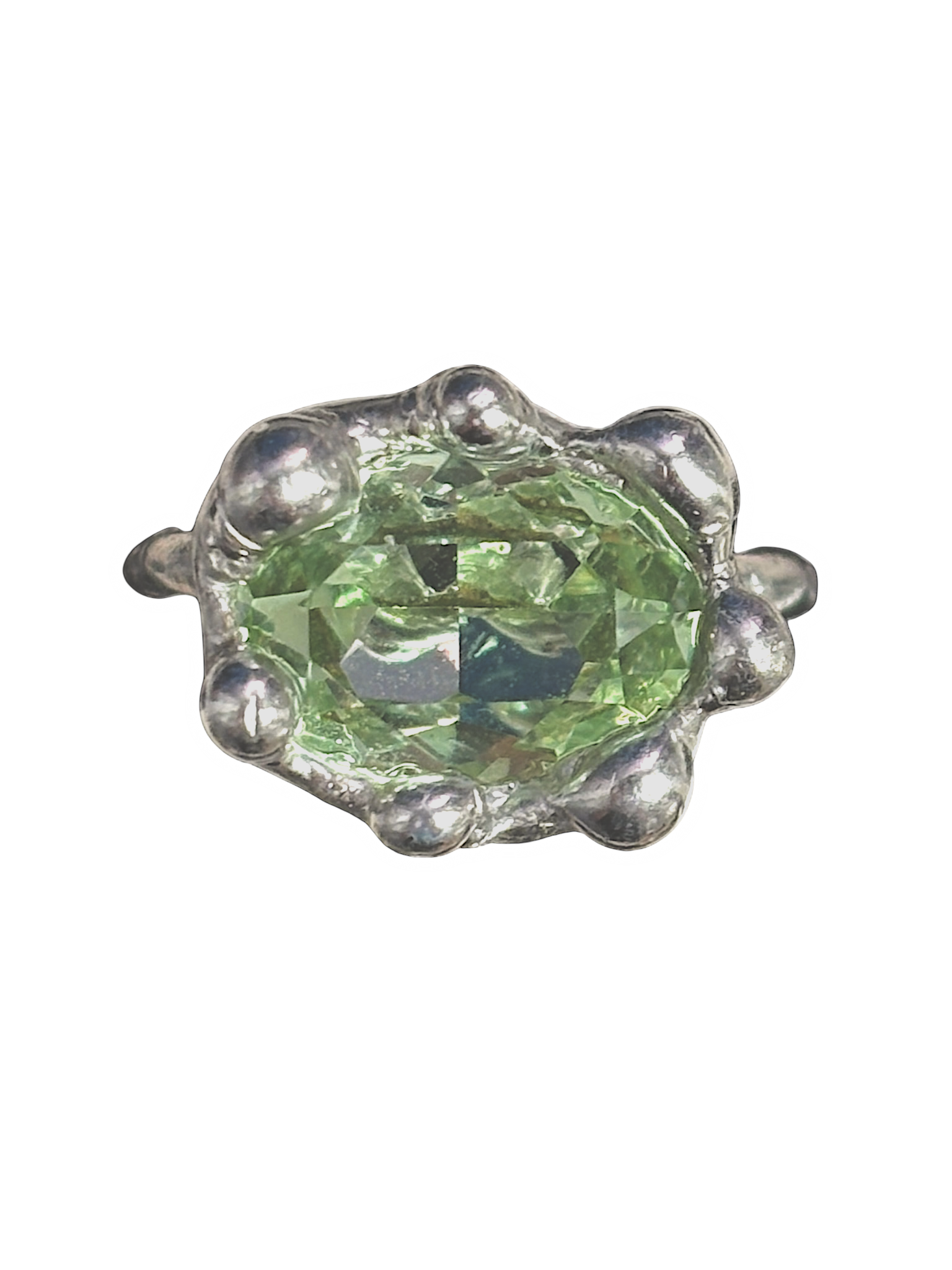 - Features a Green K9 Crystal encased in rounded soldered design, finished with a soldered band