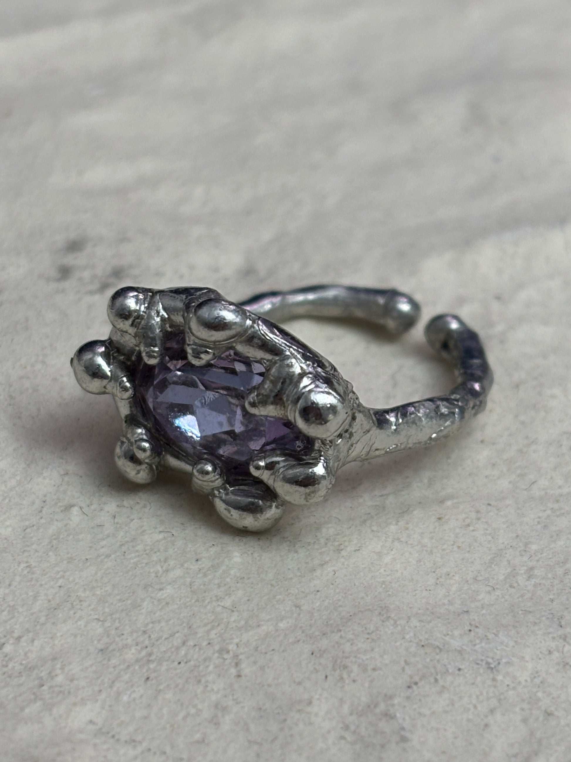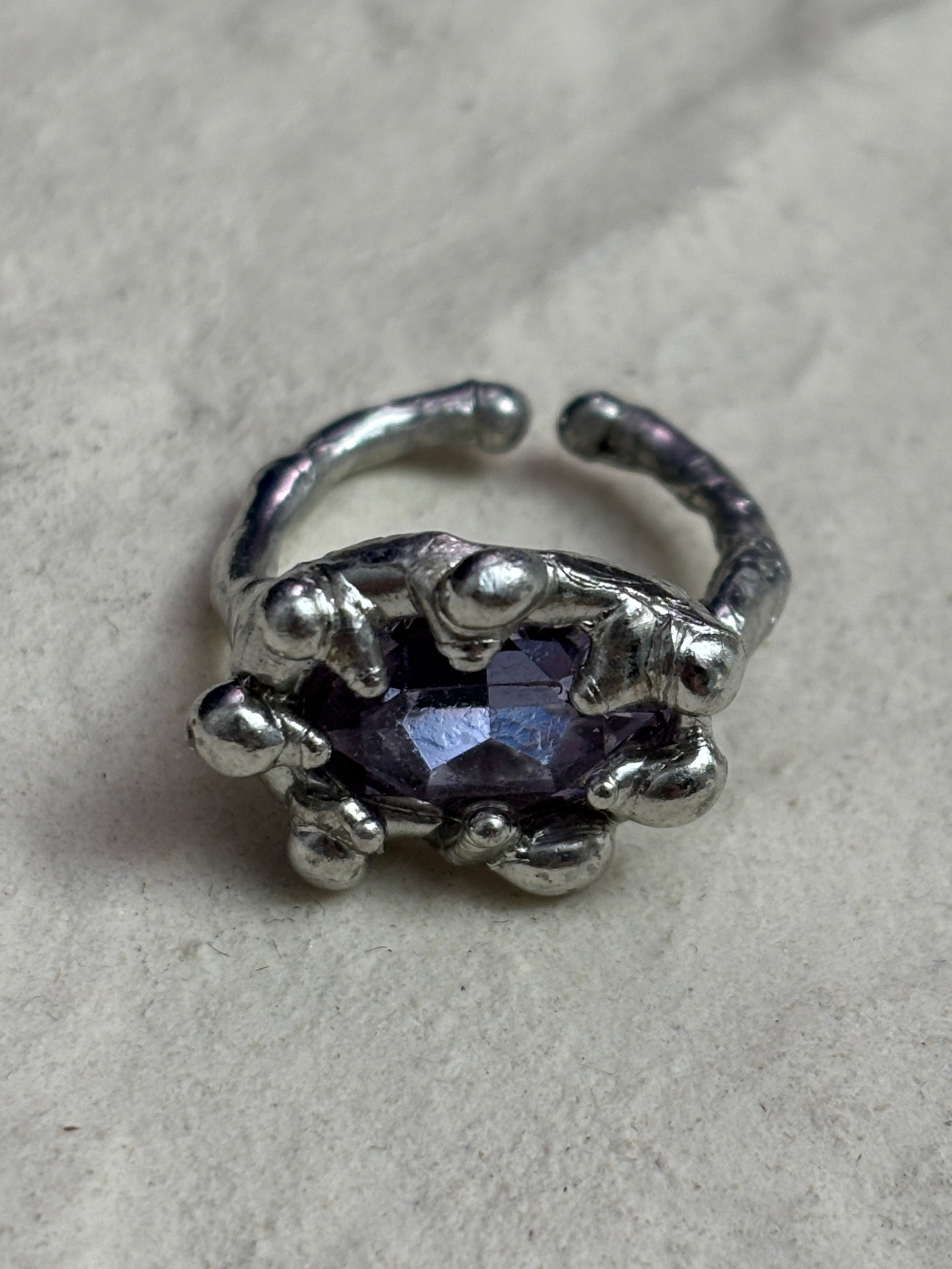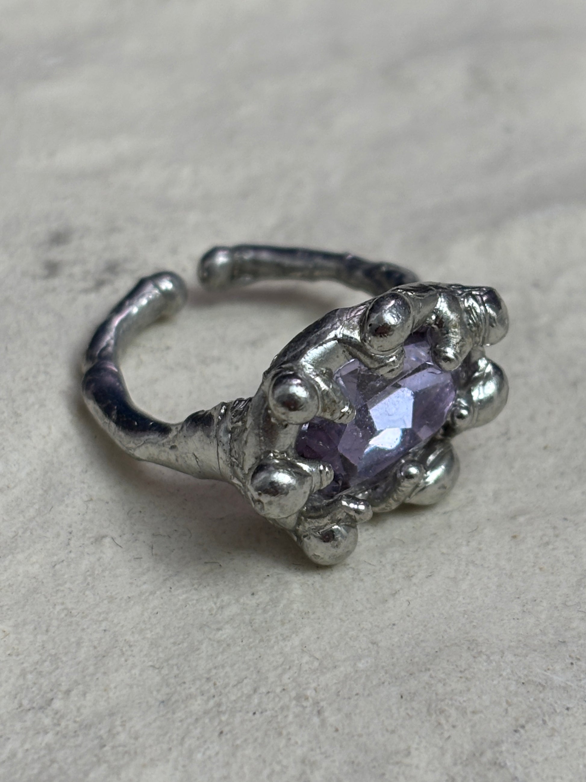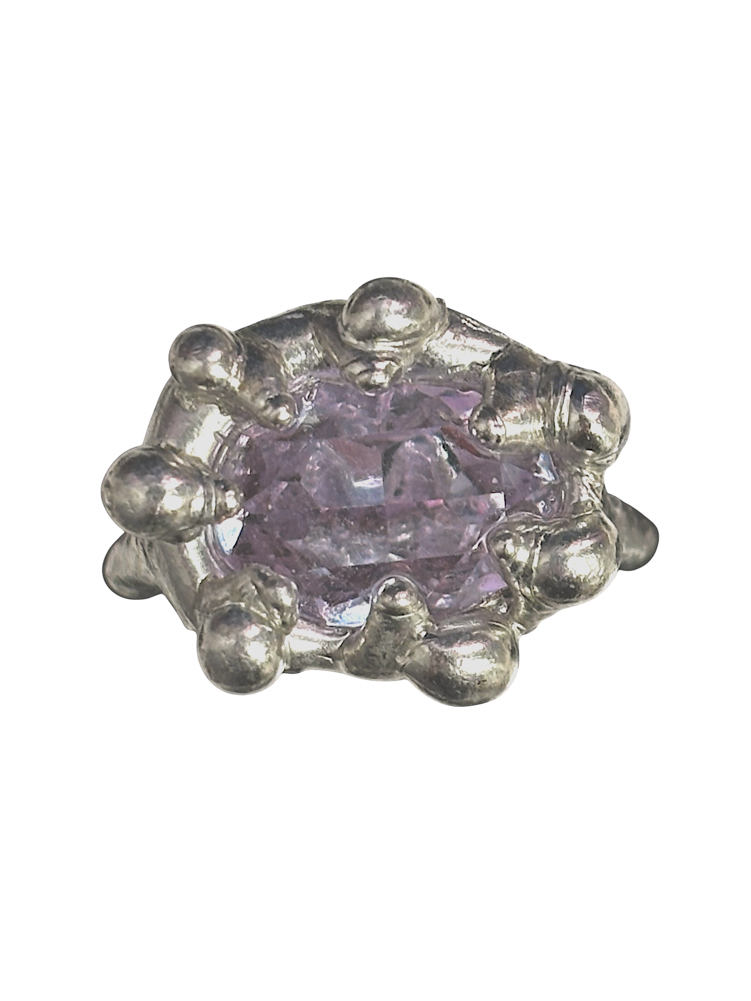 - Features a lavender purple K9 Crystal encased in rounded soldered design, finished with a soldered band