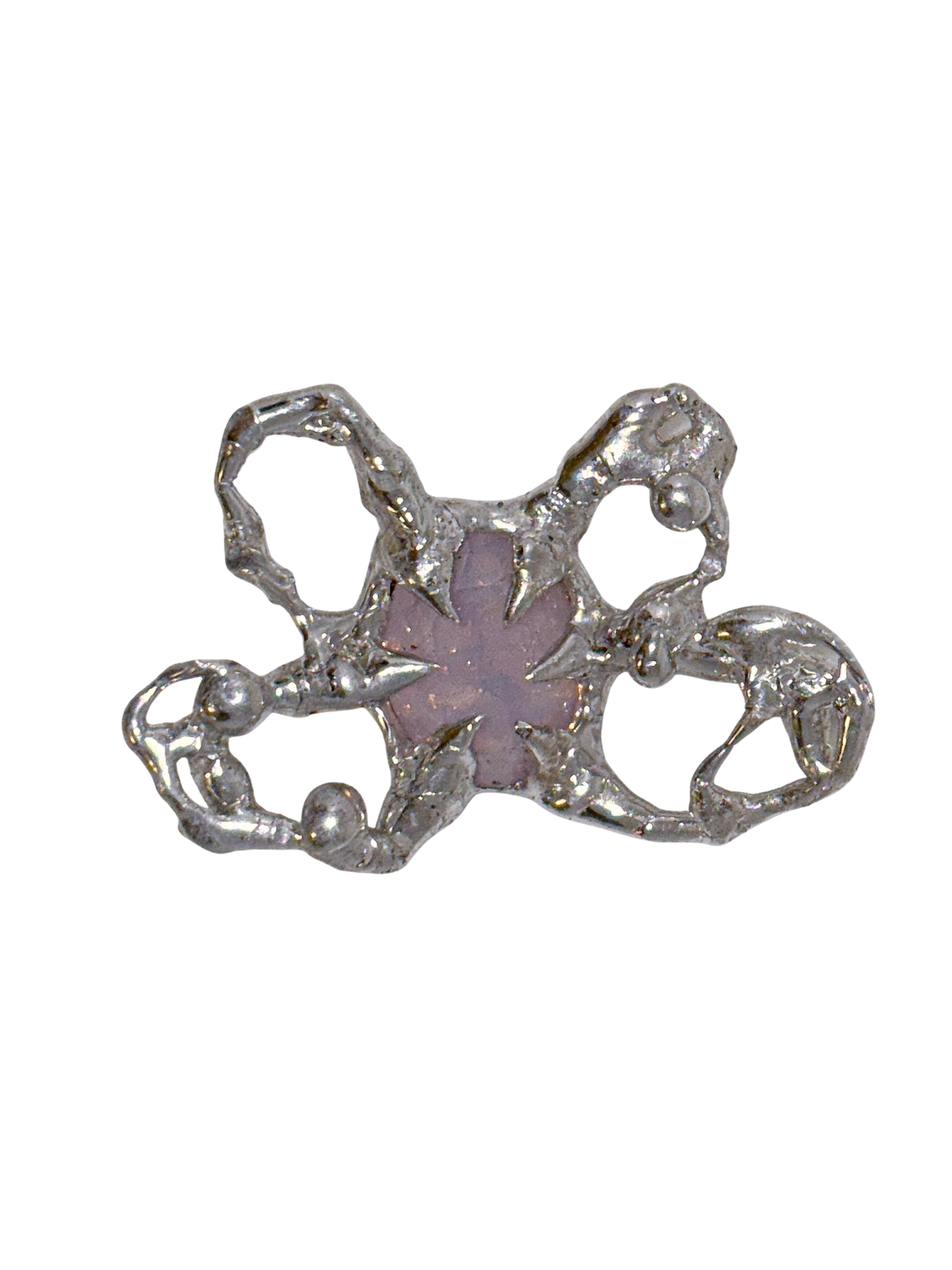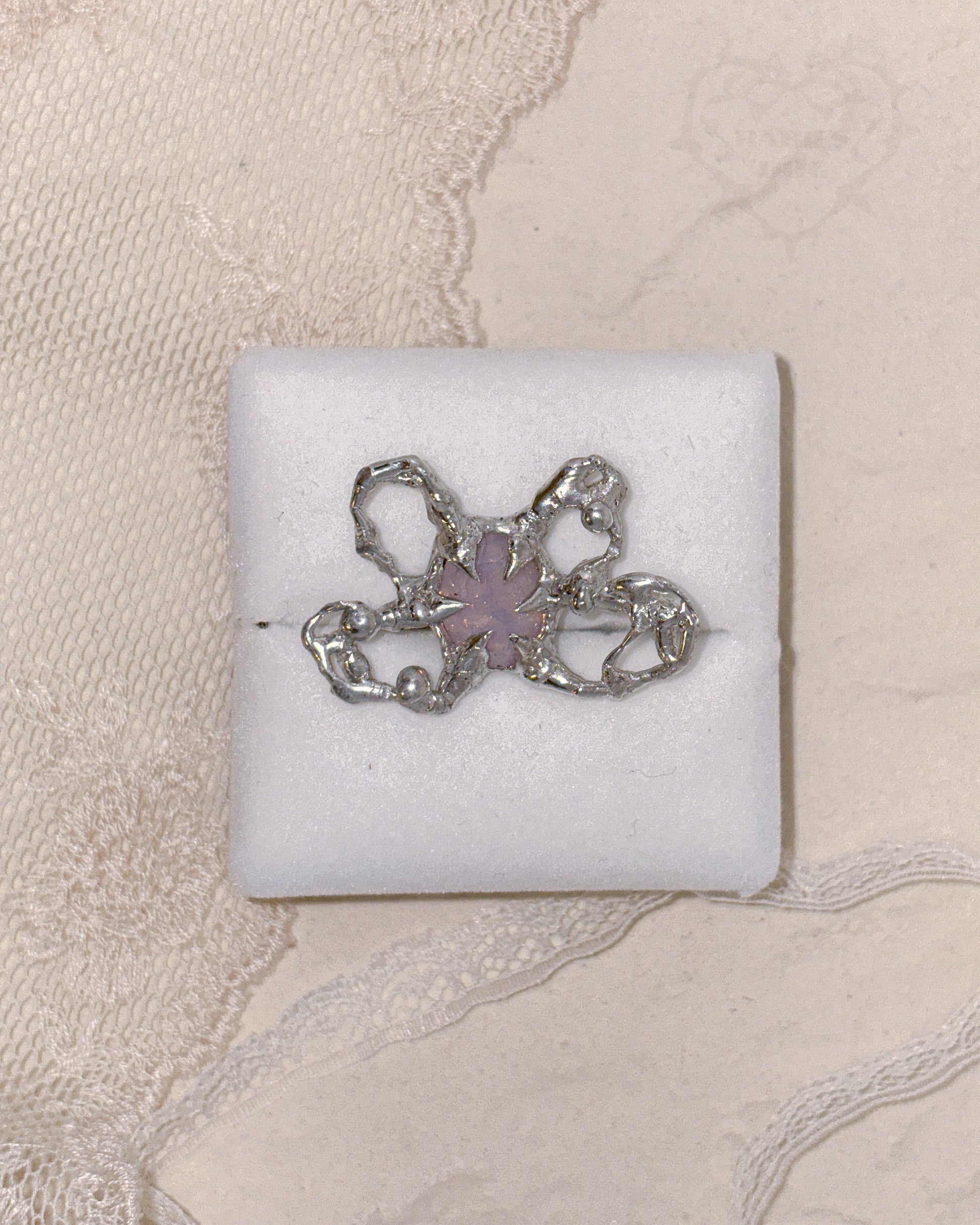- Features a Pink K9 Crystal encased in butterfly like soldered design, finished with a soldered band
