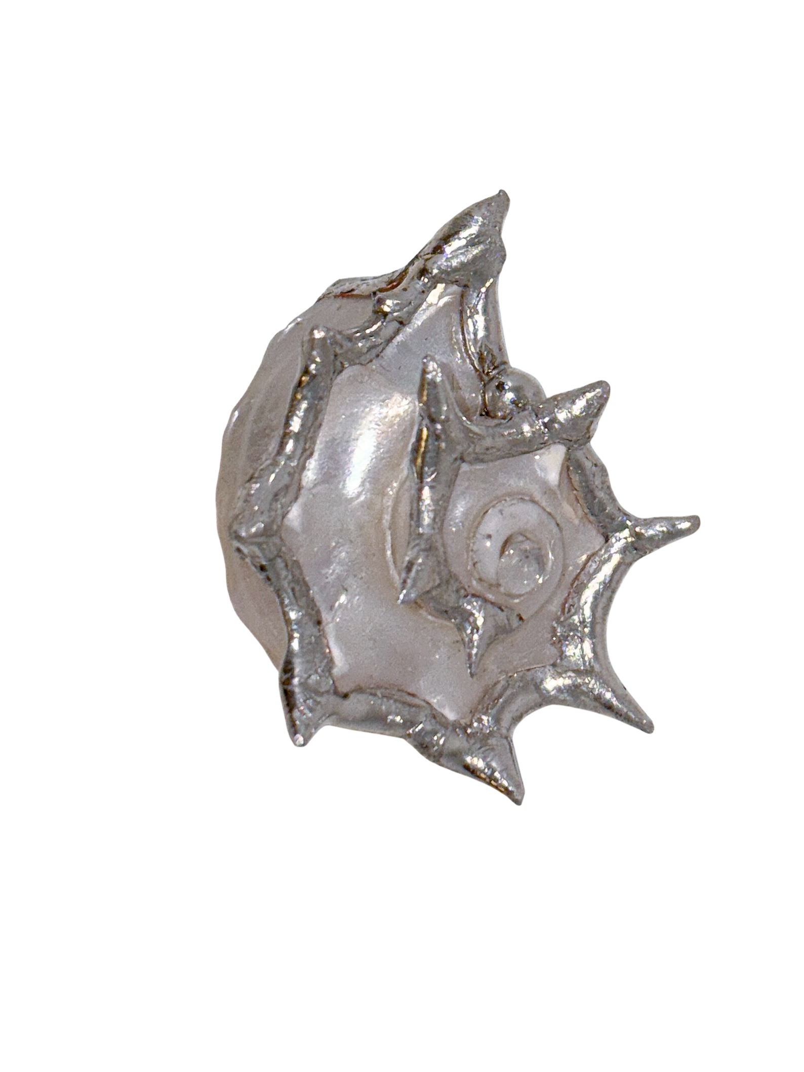 - Features a pearly white iridescent nautilus shell with protruding spikes, finished with a soldered band