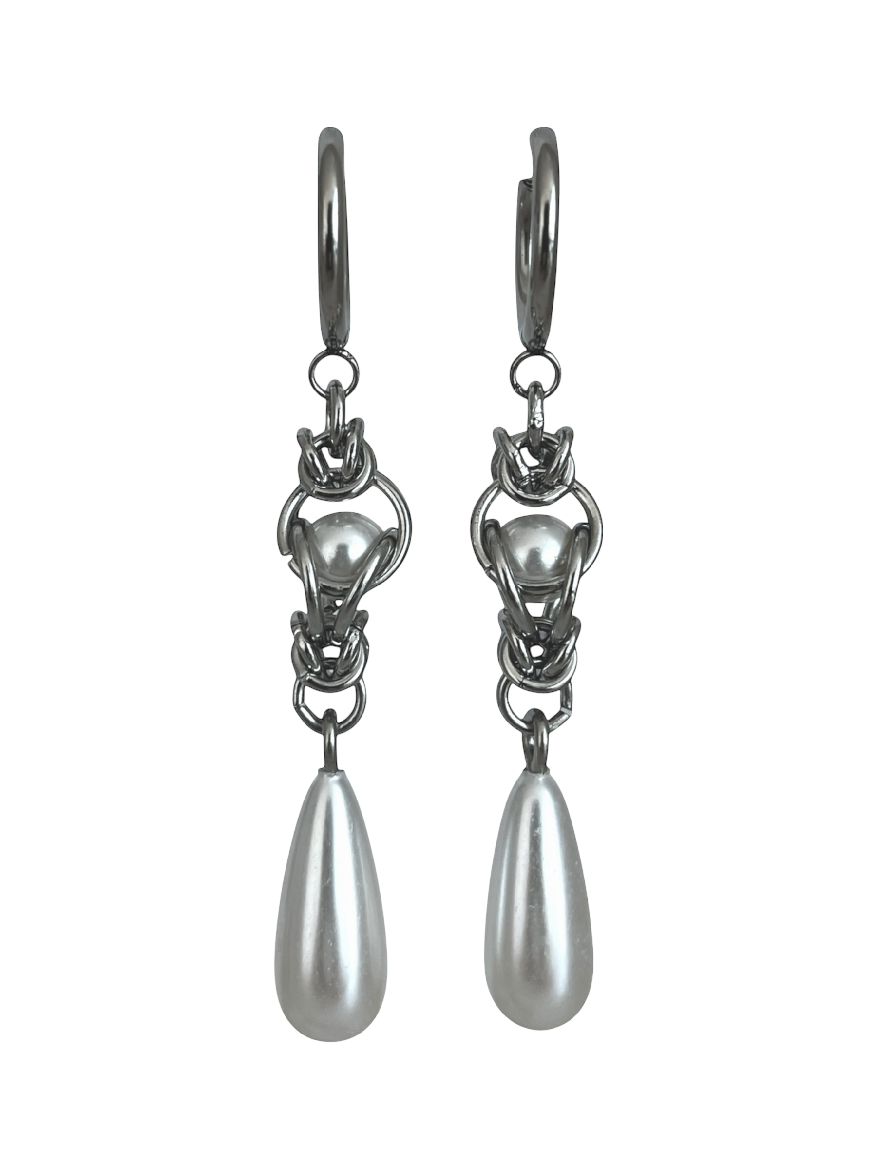 Romantic meets rebellious in these edgy stainless steel hoop earrings featuring chain mail-encased pearls and dangling pearl drop.