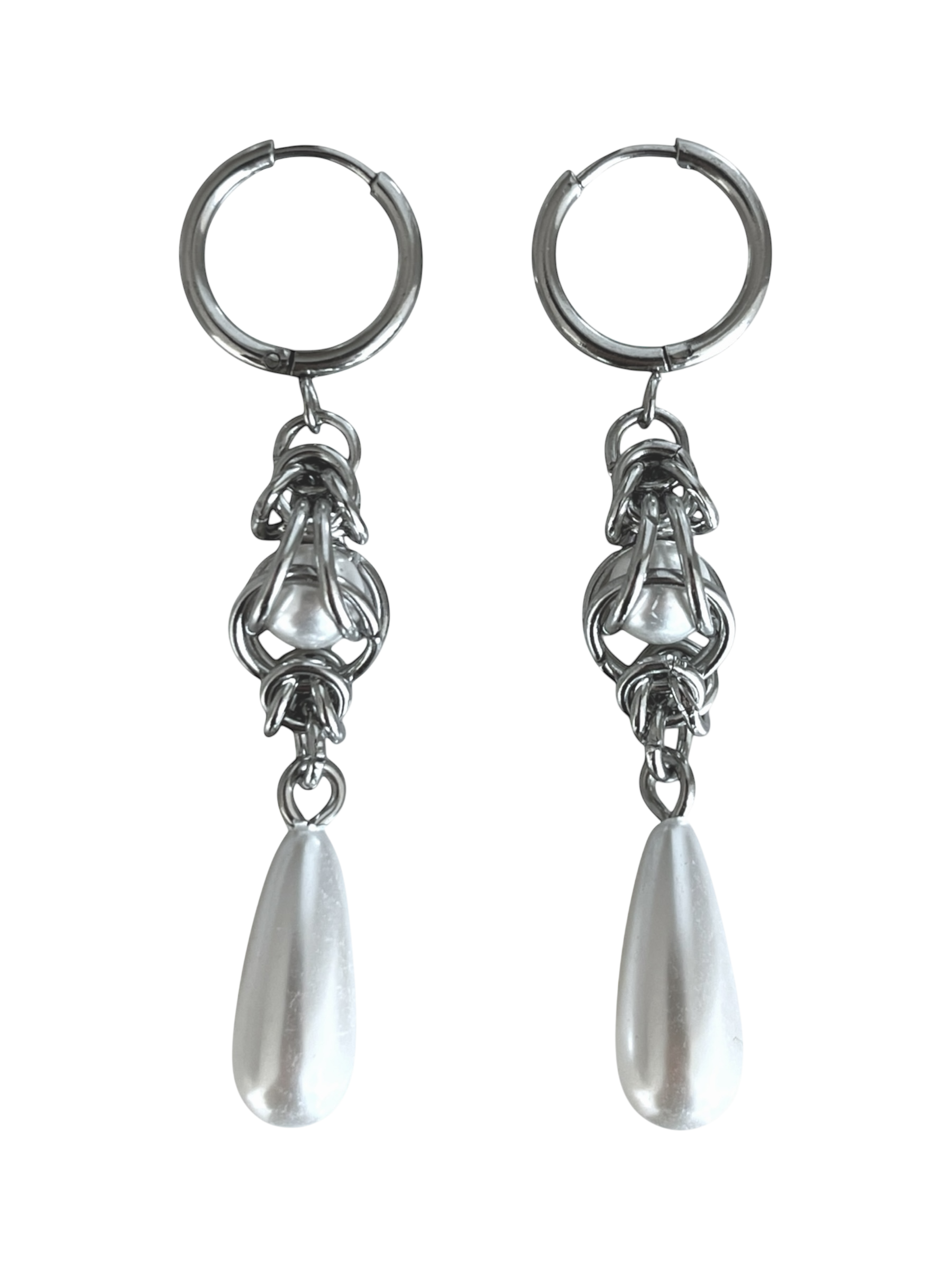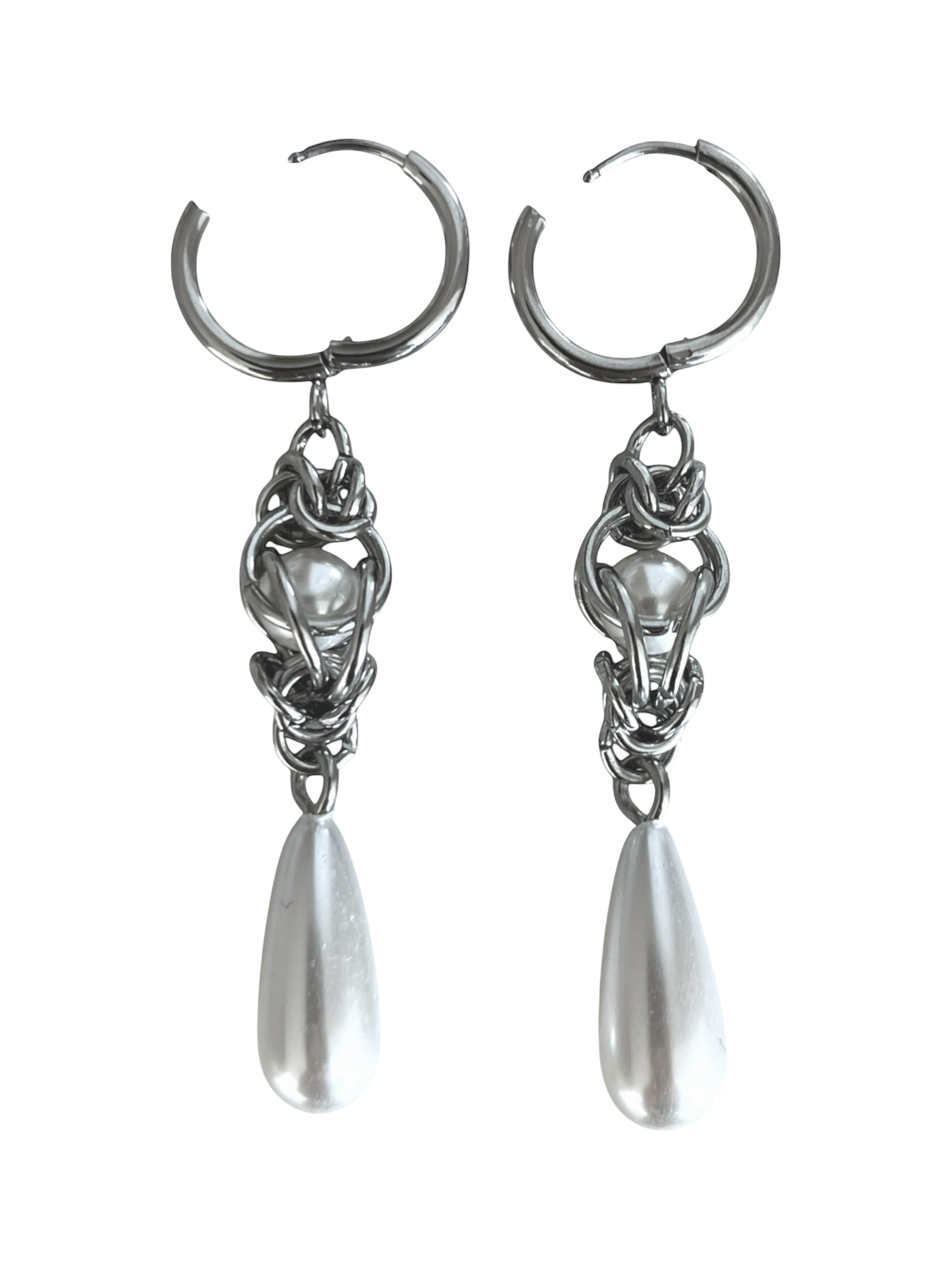 - Featuring Pearls Encased in Chain Mail with Dangling Pearl Drop on Stainless Steel Hoop Earrings
