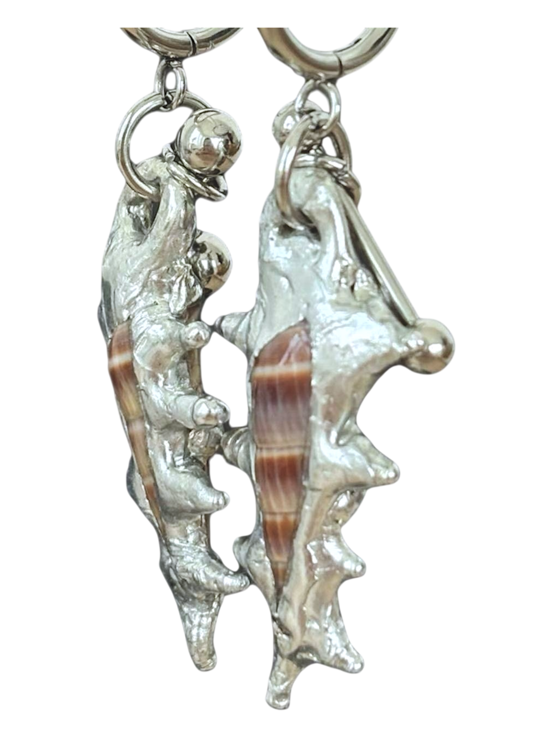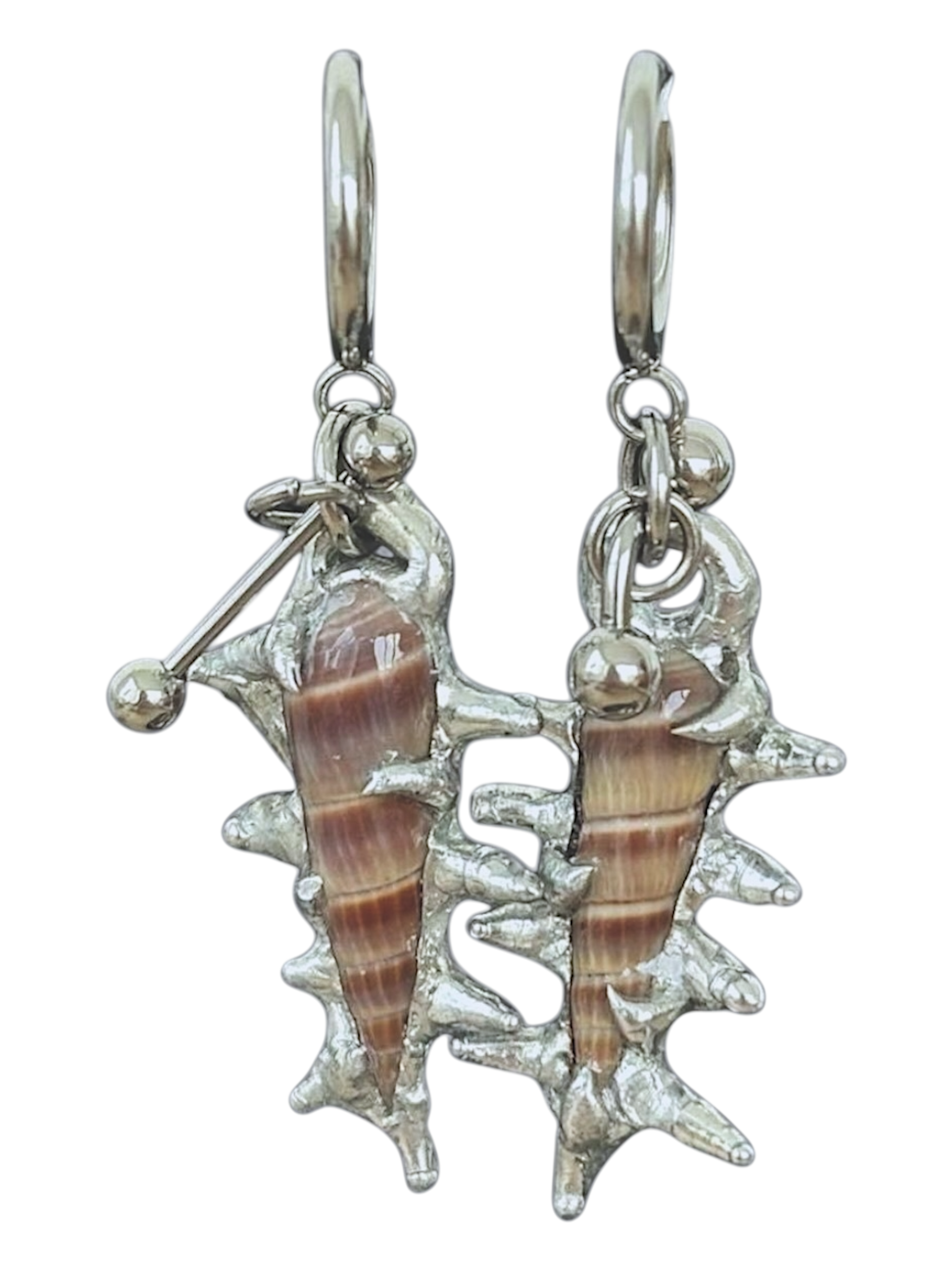- Features a cone like shell with striped print, soldered spikes, completed with barbell piercings on a pair of stainless steel hoops