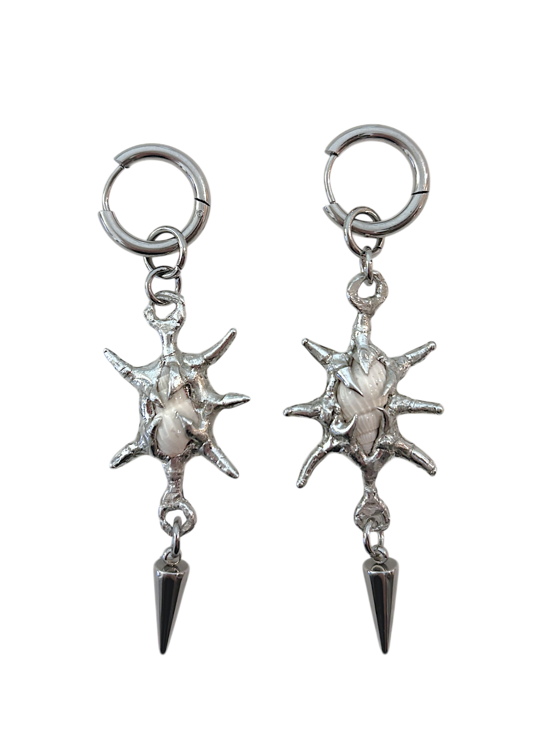 - Features a cone like white shell with soldered spikes, completed with spike charms on a pair of stainless steel hoops