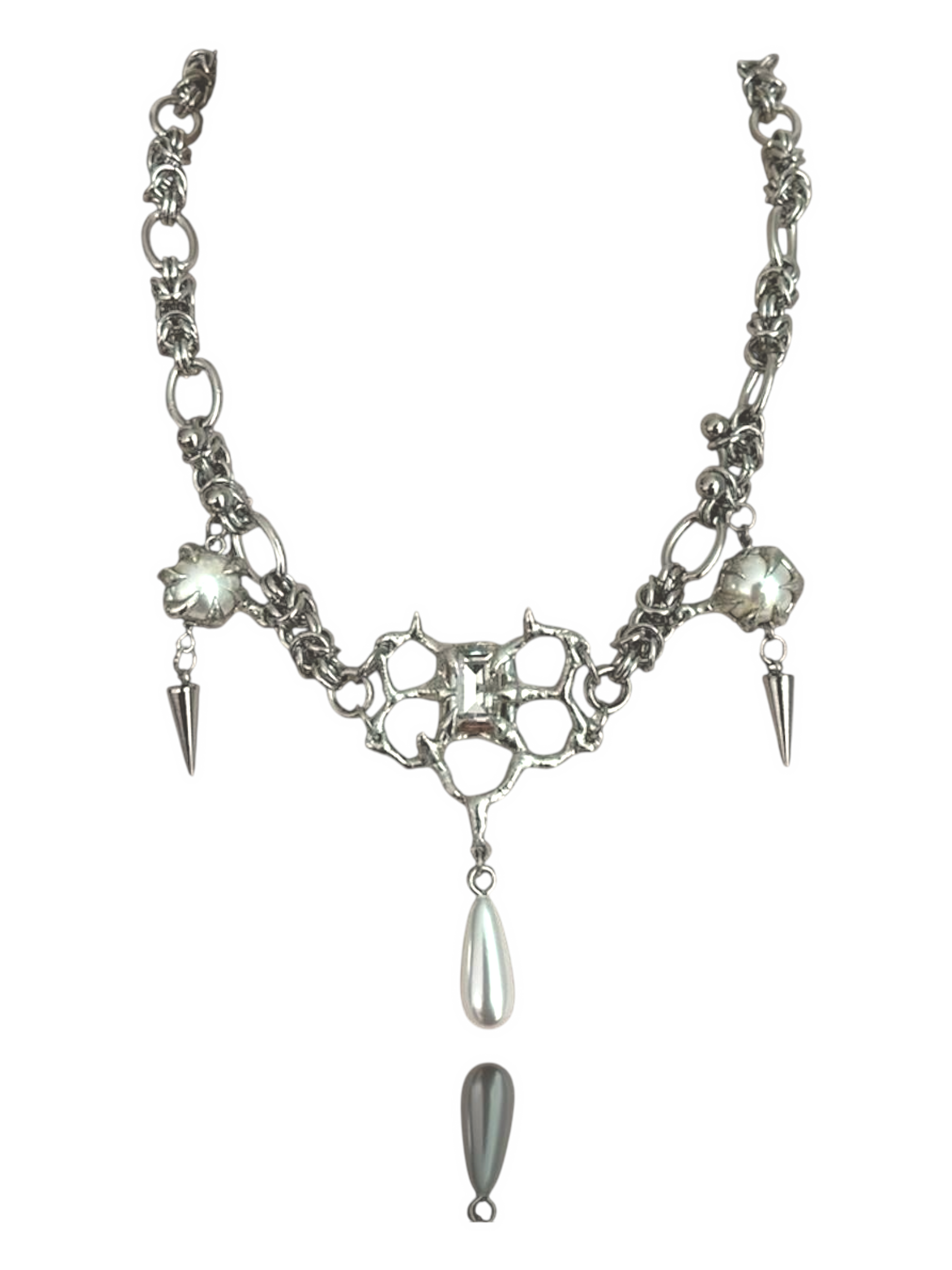 - Features a clear K9 Crystal encased in butterfly like soldered design with encased soldered pearls, stainless steel chain mail and spikes